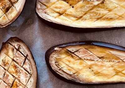 Couper les aubergines dans la longueur pour obtenir des tranches de 2-3 mm d’épaisseur, puis tailler la chair en croisillons à l’aide de la pointe d’un couteau, saler et arroser d’huile d’olive. Enfourner pour 20 minutes environ, puis réserver.